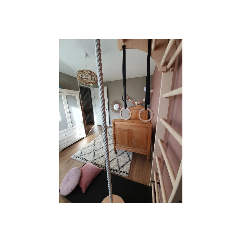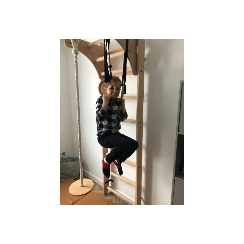 Kółka gimnastyczne zrobione są ze sklejki bukowej i zawieszone są na czarnych pasach. Perfekcyjnie wypolerowane, są gładkie i bezpieczne dla małych rąk. Pasy są wyposażone w klamrę, która pozwala na szybką regulację ich długości, jak również łatwy demontaż. Przy klamrze znajduje się rzep, w który można zwinąć nadmiar pasa. Kółka mogą być używane jak liny TRX przez większe dzieci lub dorosłych.