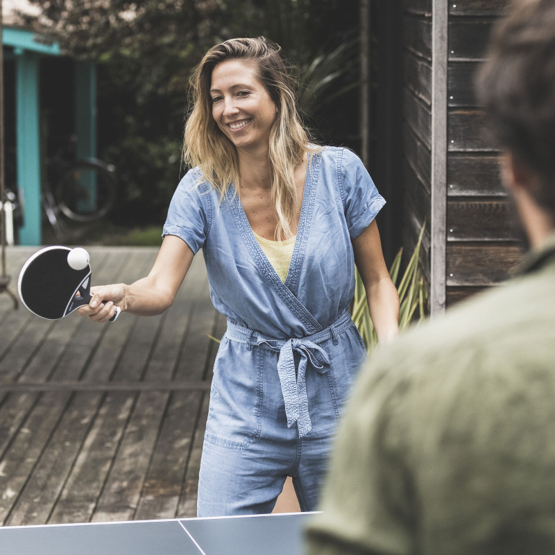 Stół tenisowy 400X marki Cornilleau to najwyższy model przeznaczonej do użytku zewnętrznego serii Sport. Jest to idealny wybór dla całej rodziny. Dzięki podwójnemu systemowi zabezpieczeń DSI oraz podwójnym kołom i mocnym hamulcom, każdy poradzi sobie z jego obsługą. Stół odporny jest na warunki atmosferyczne i doskonale sprawdzi się w ogrodzie lub na tarasie. Dynamiczny wygląd 400X łączy w sobie klasę i nowoczesność. Projektanci zadbali o najmniejsze szczegóły, bazując na opinii klientów oraz własnym 50 letnim doświadczeniu. Eksperci z Cornilleau we Francji gwarantują przynajmniej 10 lat dobrej zabawy. POWŁOKA ANTYREFLEKSYJNA: Powierzchnia 5 mm blatu wykonanego ze specjalnego laminatu żywicznego pokryta jest specjalną powłoką antyrefleksyjną SOFTMAT®. Struktura blatu jest odporna na zarysowania, uderzenia, promienie UV oraz łatwa w czyszczeniu. REGULOWANA SIATKA: Siatkę przy zamykaniu stołu można schować pomiędzy blatami, a następnie wygiąć na bok. Zapewnia to zmniejszenie zajmowanego miejsca i zabezpiecza ją przed rozerwaniem. Siatka posiada system regulacji napięcia. LICZNIK PUNKTÓW: Przy krawędziach stołu znajdują się manualne liczniki punktów gry. Poręczne, praktyczne i satysfakcjonujące…gdy wygrywasz. KIESZENIE NA AKCESORIA: Funkcjonalne kieszenie umieszczone po obydwu stronach stołu, pozwalają przechowywać 4 rakietki i 4 piłeczki. Takie rozwiązanie zagwarantuje szybki dostęp do potrzebnych akcesoriów bez zbędnego szukania, oraz ułatwi utrzymanie porządku. ALUMINIOWA RAMA: Aluminiowa rama w połączeniu z blatem daje grubość 55 mm i dzięki niemu jakość odbić dorównuje najbardziej profesjonalnym stołom. Wszystkie stoły do użytku zewnętrznego zapewniają gwarancję przynajmniej 10 lat dobrej zabawy. DUŻE KOŁA Z HAMULCAMI: Stoły ping pongowe Cornilleau posiadają duże podwójne koła o grubości 32 mm i średnicy 200 mm. Takie rozwiązanie zwiększa toczenie kół oraz stabilność stołu. Większe koło z łatwością wtoczy się przez duże przeszkody takie jak schody, progi kamienie. Łatwiej pokonuje gęstą trawę i inne nierówności, z kolei dwa hamulce zapewniają doskonałą stabilność i bezpieczeństwo podczas gry. Jest to także szczególnie przydatne gdy stół jest przechowywany na lekko nierównej powierzchni. REGULACJA I STABILNOŚĆ: Średnica ruchomej stopki to aż 104 mm, a zakres regulacji wysokości to -1 do +5 cm. Dzięki temu stół możesz stabilnie ustawić nawet na nierównej powierzchni ogrodu tak, aby grało się wygodnie. DANE TECHNICZNE: Rodzaj blatu: 5 mm laminat żywiczny Rama blatu: alucynk, grubość 50 mm Grubość całkowita: 55 mm Kolor blatu: niebieski Pokrycie powierzchni blatu: SOFTMAT® System blokowania blatu: DSI®, 16 punktów blokujących, blokada w dwóch pozycjach. Nogi stołu: grube, wzmocnione plastikiem, średnica ruchomej stopy 104 mm, zakres regulacji wysokości -1 do +5 cm Siatka: regulacja napięcia, składana Koła: 8 sztuk po 32 x 200 mm (grubość x średnica), instalowane w parach, 2 hamulce Wymiary stołu po rozłożeniu: 76 x 274 x 152,5 cm Wymiary stołu złożonego: 74 x 161 x 155,5 cm Waga stołu: 58 kg, w opakowaniu 68 kg Norma: EN 14468-1; klasa C Kraj produkcji: Francja Gwarancja: 10 lat cały stół Dostępność części: 20 lat od daty zakupu Przeznaczenie: użytek domowy, a także w hotelach ZASTOSOWANE TECHNOLOGIE: SOFTMAT®: Specjalna opatentowana matowa powłoka stołu, dzięki której od blatu odbija się 3 razy mniej promieni słonecznych. Zapewnia ona lepszy komfort gry, ponieważ promienie nie odbijają się od stołu i nie rażą oczu graczy. Zwiększa to skupienie się na piłeczce i nie męczy wzroku. COMPACT TECHNOLOGY®: Opatentowany system zapewnia maksimum bezpieczeństwa i łatwość składania stołu. Złożony stół nie zajmuje dużo miejsca i jest stabilny podczas przechowywania oraz transportowania. Ta technologia pozwala nam także na grę w pojedynkę przez złożenie tylko jednego z blatów. DSI (Double Security Integree)®: Podwójny system zabezpieczeń. Centralny uchwyt zwalniający zapewnia łatwe rozkładanie i składanie stołu. System składa się z 16 punktów blokujących, które zapobiegają upadkowi blatu. System blokuje dodatkowo stół podczas otwierania w pozycji pół otwartej pod kątem 65 stopni. Zapobiega wypadkom podczas otwierania, szczególnie przez dzieci oraz osoby słabsze i niższe. Innym słowy blat nie uderzy nas w głowę lub nie opadnie bez wcześniejszego zablokowania. FRANCUSKA RECEPTURA: Kluczem do sukcesu Cornilleau jest innowacyjne podejście do projektowania oraz produkcji stołów i akcesoriów. Firma przykłada dużą wagę do wprowadzania nowych technologii i rozwiązań, dlatego od ponad 50 lat jest niekwestionowanym liderem na rynku.